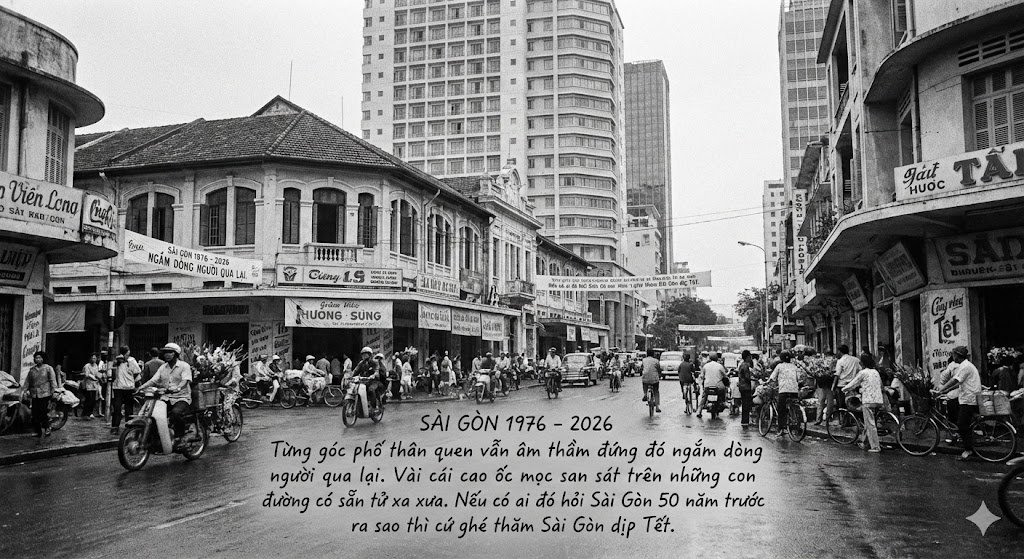 Mấy chục năm Sài Gòn quê tôi vẫn vậy. Từng góc phố thân quen vẫn âm thầm đứng đó ngắm dòng người qua lại. Vài cái cao ốc mọc san sát trên những con đường có sẵn tử xa xưa. Nếu có ai đó hỏi Sài Gòn 50 năm trước ra sao thì cứ ghé thăm Sài Gòn dịp Tết.